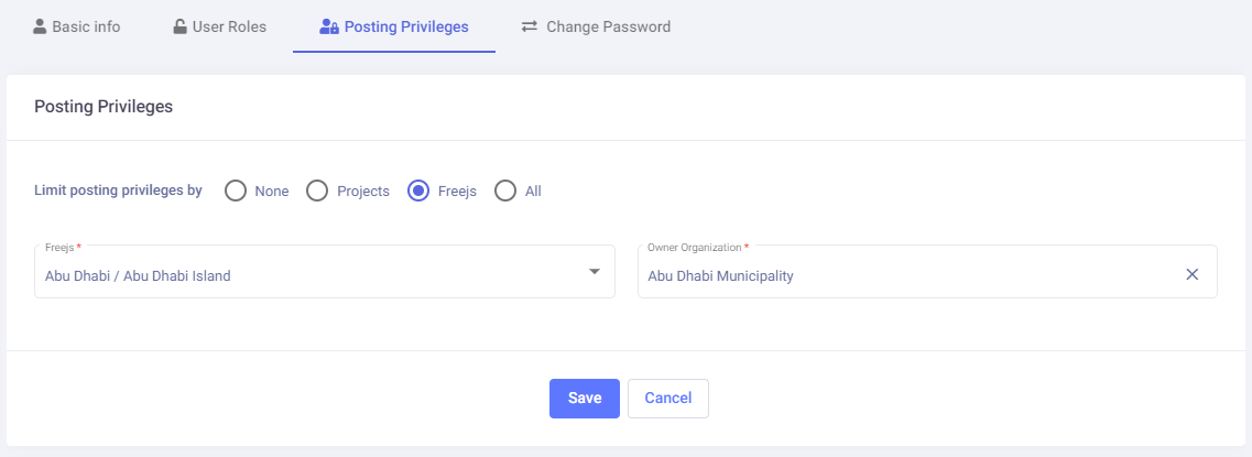- Posting Privileges( in this section you can choose posting privilege’s for the admin user withier ( none , projects, freejs , all))