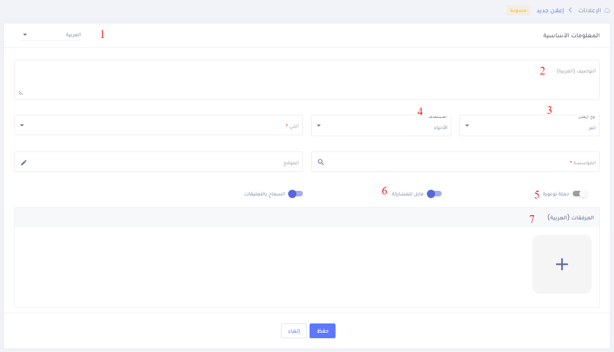 يمكن لمدير فريجنا أن يقوم بإنشاء إعلان في فريجنا مرتبط بحيّ أو مشروع، من خلال الضغط على زر إعلان جديدة، حيث يتم تحويله إلى نموذج إدخال معلومات الإعلان.