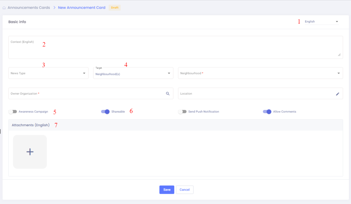 Freejna admin can create an announcement related to a neighborhood or a project by clicking “create announcement card “, then he will be redirected to the “create announcement card” Form