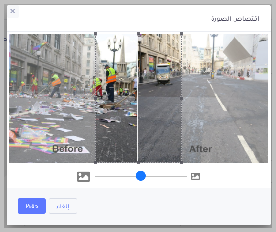 - الصور (إجباري) : وهذه الصور إجبارية لإنشاء البطاقة فأحدها صورة للحدث قبل النشاط والأخرى صورة للحدث بعد النشاط، عند إضافة صورة ما يتم إظهار إمكانية لاقتطاع الصورة الأصلية وعرضها بعد الاقتطاع كما ستظهر في التطبيق