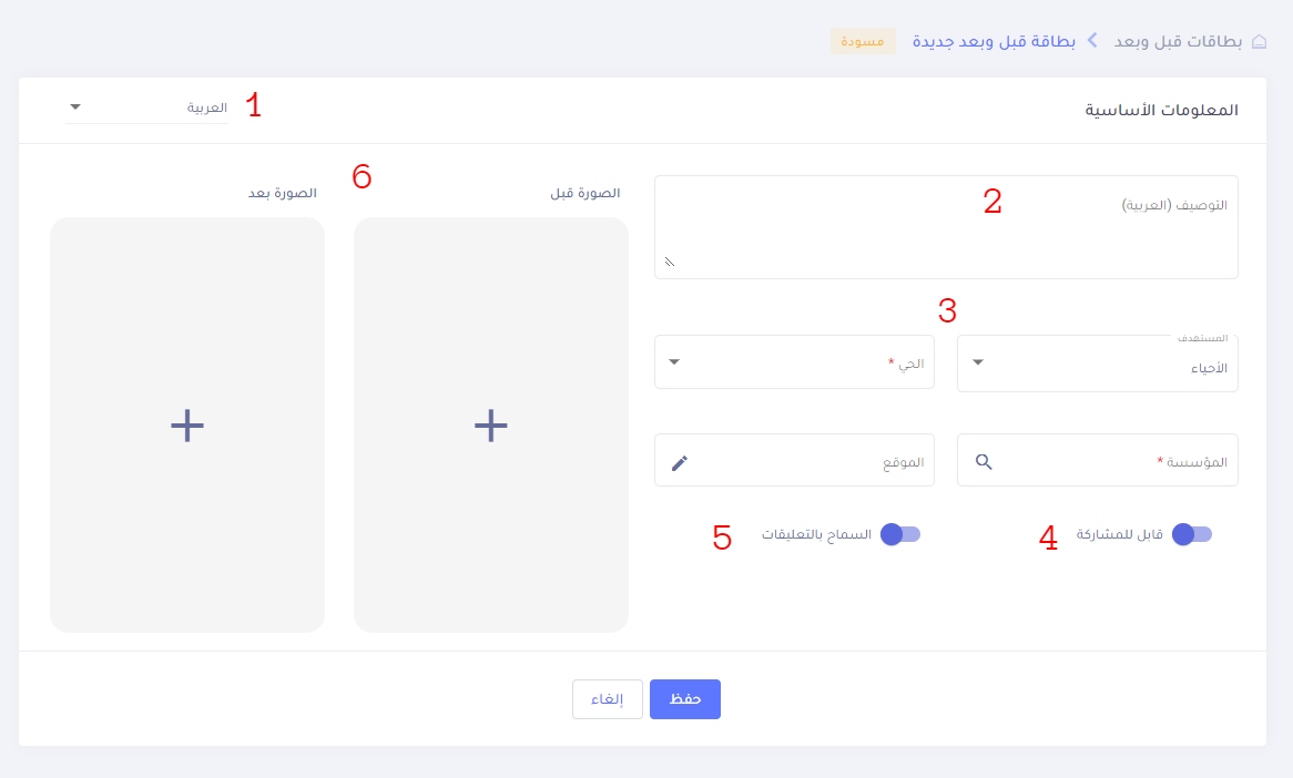 يمكن للمدير أن يقوم بإنشاء بطاقة قبل وَبعد في فريجنا وتكون مرتبطة بحيّ أو مشروع ، من خلال الضغط على زر إضافة بطاقة قبل وَبعد، حيث يتم تحويله إلى نموذج إدخال معلومات البطاقة.
