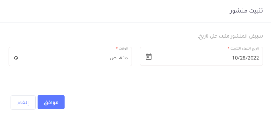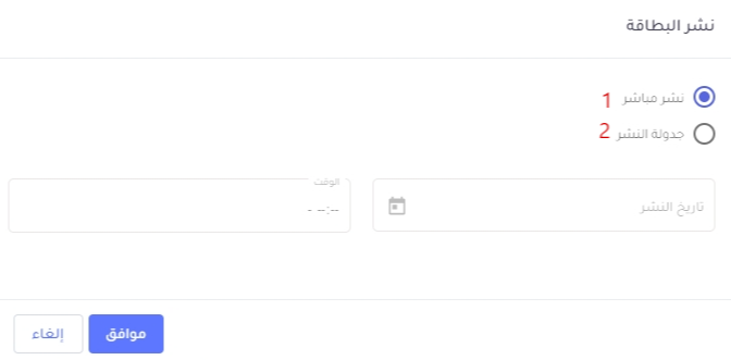 - نشر مجدول :يتيح هذا الخيار للمدير جدولة النشر باختيار التاريخ والوقت المناسب لنشر بطاقته، ويتم تلقائيَا نشرها بالوقت المحدد، في حال كانت البطاقة منشورة يمكن للمدير أن يقوم بأرشفة البطاقة أو إعادتها إلى مسودة