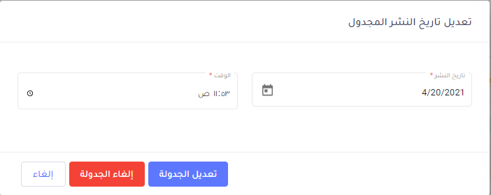 في حالة التعديل سيتم اعتماد التاريخ الجديد اما في حالة الالغاء سيتم الغاء الجدولة سيتم ازالة الجدولة واعادة زر النشر القديم للمسودة