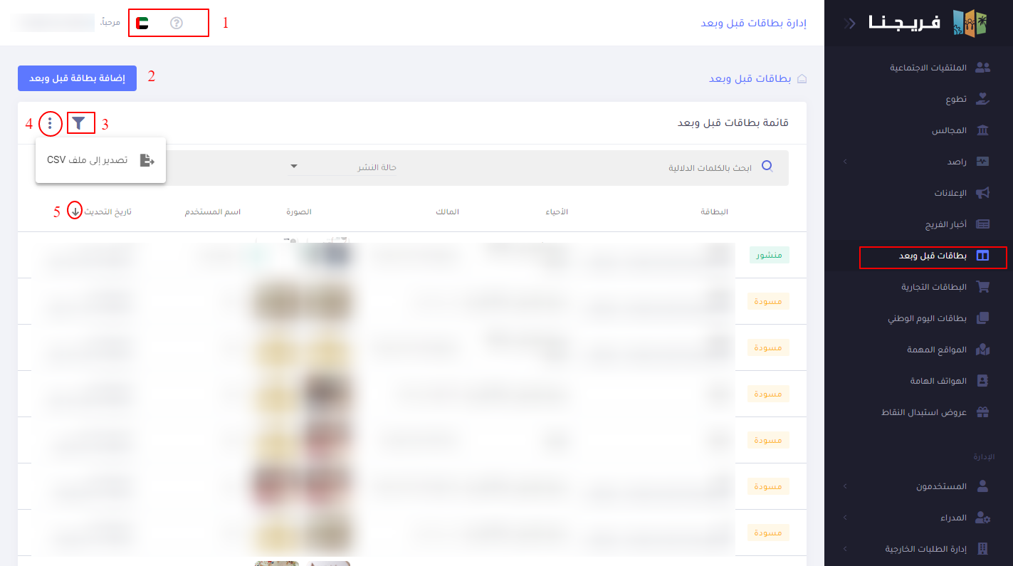 يمكن لمستخدم إدارة فريجنا أن يقوم بعرض جميع بطاقات قبل و بعد المضافة إلى قاعدة بيانات فريجنا من خلال جدول يحوي ( عنوان البطاقة، الحي/ الأحياء، مالك الفعالية، صور البطاقة، اسم المستخدم، آخر تاريخ لتعديل البطاقة).
