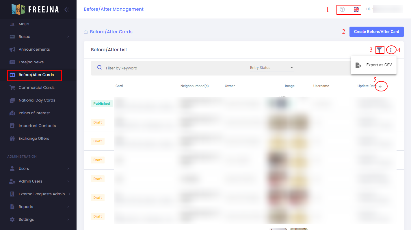 - Admin user can switch between languages (English and Arabic ) , with ? sign user can explore the before/after cards Docs .