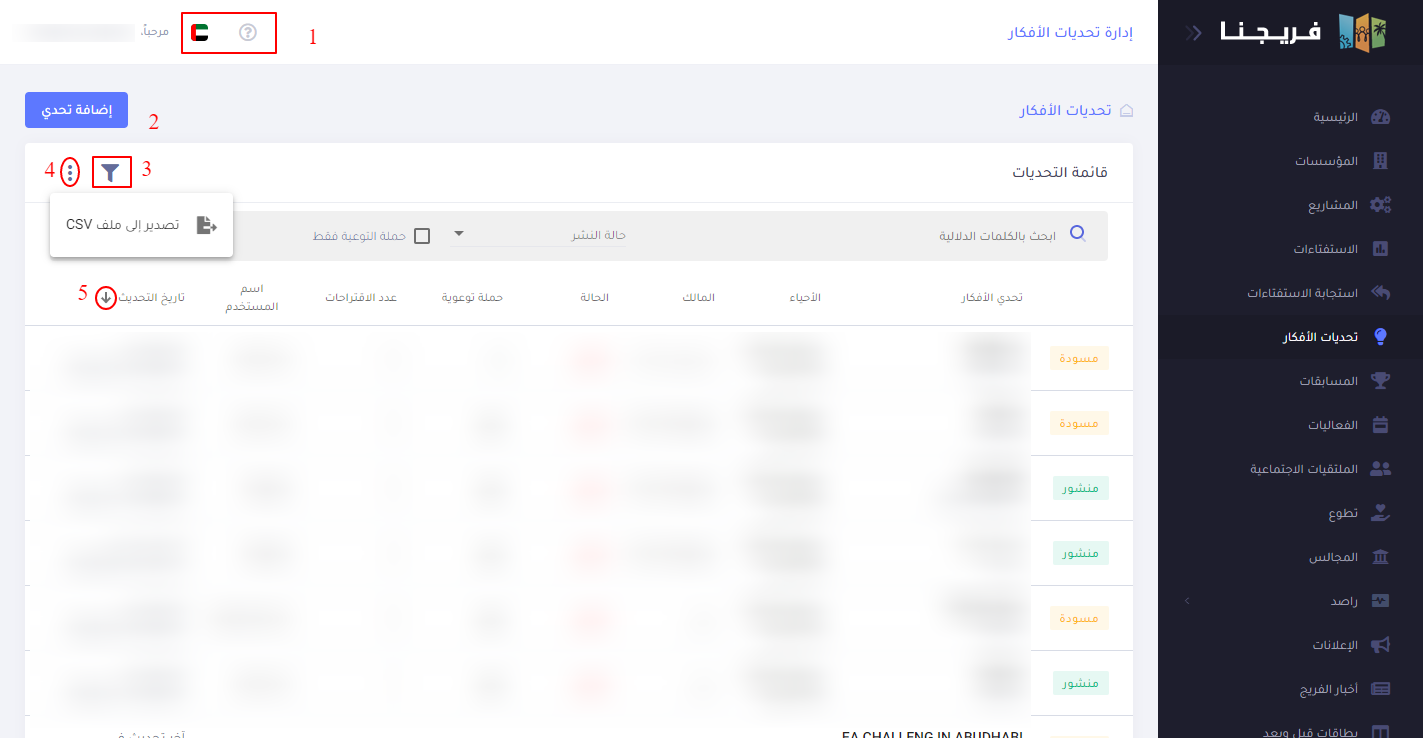 - يمكن لمستخدم الإدارة ان يستعرض تحديات الأفكار باللغات المختلفة (العربية و الإنجليزية) , وإشارة ؟ تشير الى دليل استخدام فريجنا للمساعدة على فهم تحديات الأفكار.