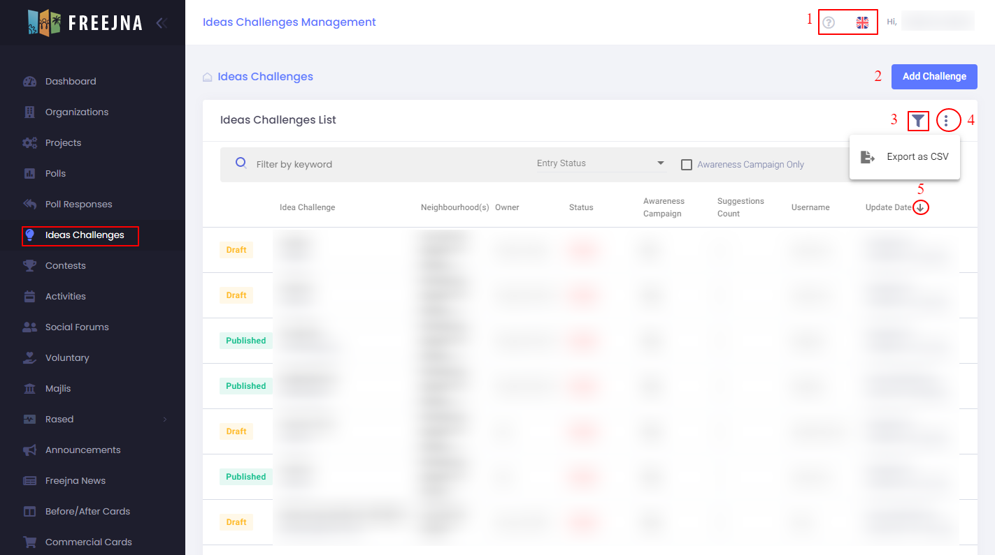 All Ideas ideas challenges card that were added to the Freejna database are displayed in a table containing information about the activity (ideas challenge description, neighborhood(s), ideas challenge owner, status, awareness campaign, suggestions count, username and updated date).