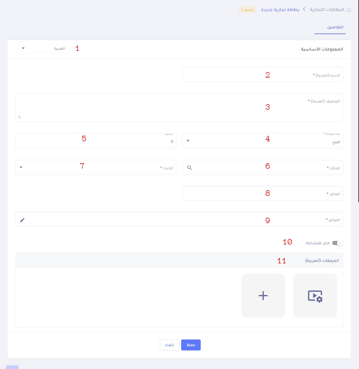 - الموقع (إجباري) : يتطلب على مستخدم الادارة أن يقوم بإضافة الموقع المحدد للبطاقة