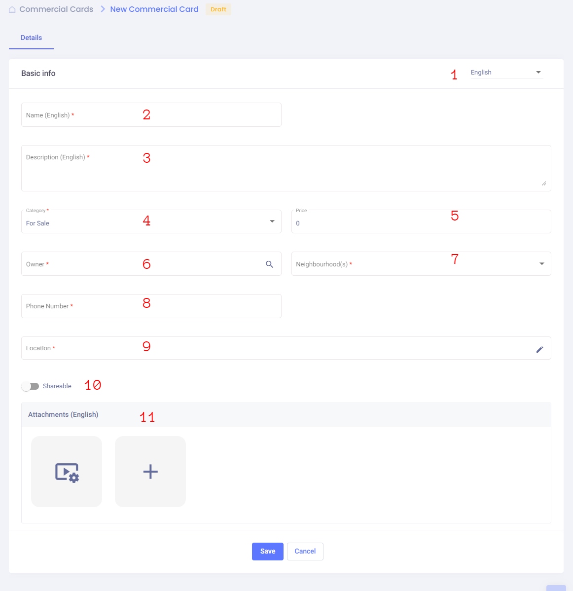 - Attachments (required) : the admin must add the an attachment (image or video) based on selected language in option1 to the commercial card :