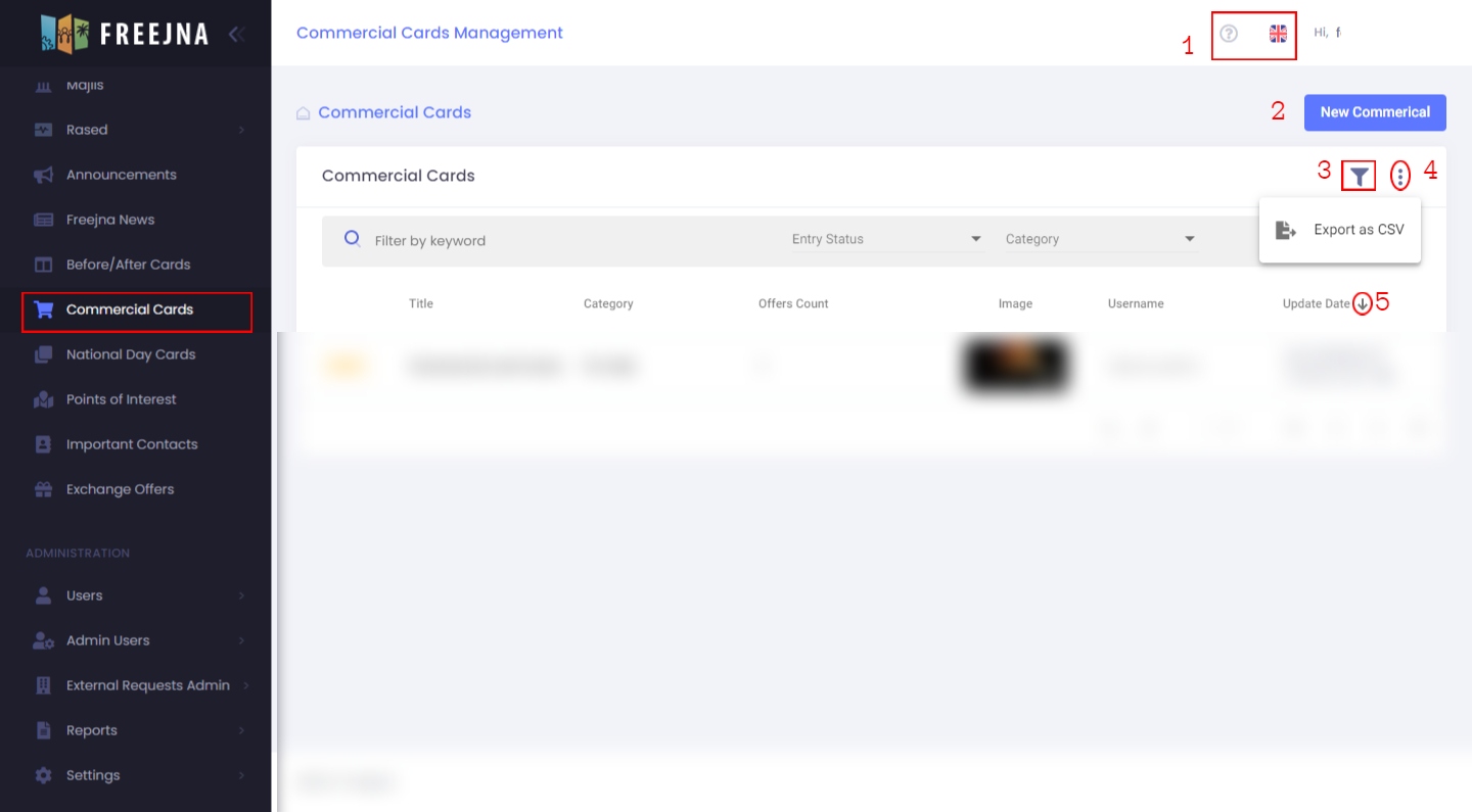 All commercial cards that were added to the Freejna database are displayed in a table containing information about the card (card title, category, offers count, card image, username, card updated date).
