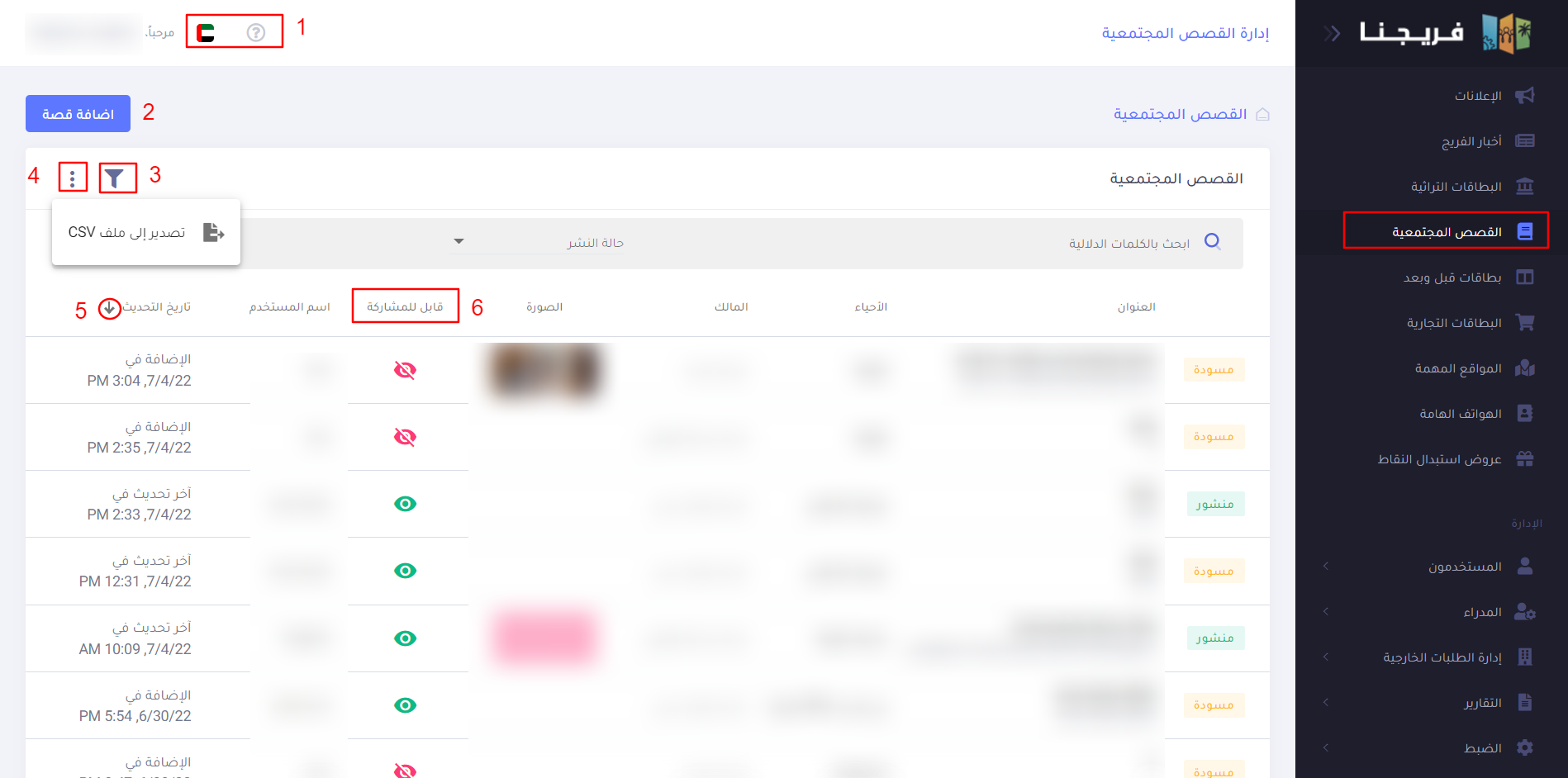 - يمكن لمستخدم الإدارة إعادة ترتيب القصص المجتمعية وفقاً للتحديث الزمني إما من الاحدث الى الاقدم او العكس.