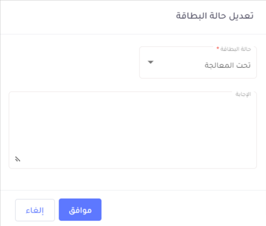 - تعديل الحالة : يتيح هذا الزر لمدير ادارة فريجنا من تعديل حالة البطاقة (تحت المعالجة، رفض الحالة لعدم الاختصاص، مغلق) وإضافة إجابة للاحتياج يظهر للمستخدمين النهائين في الجوال وحين الضغط عليه يظهر مربع لكتابة الرد .