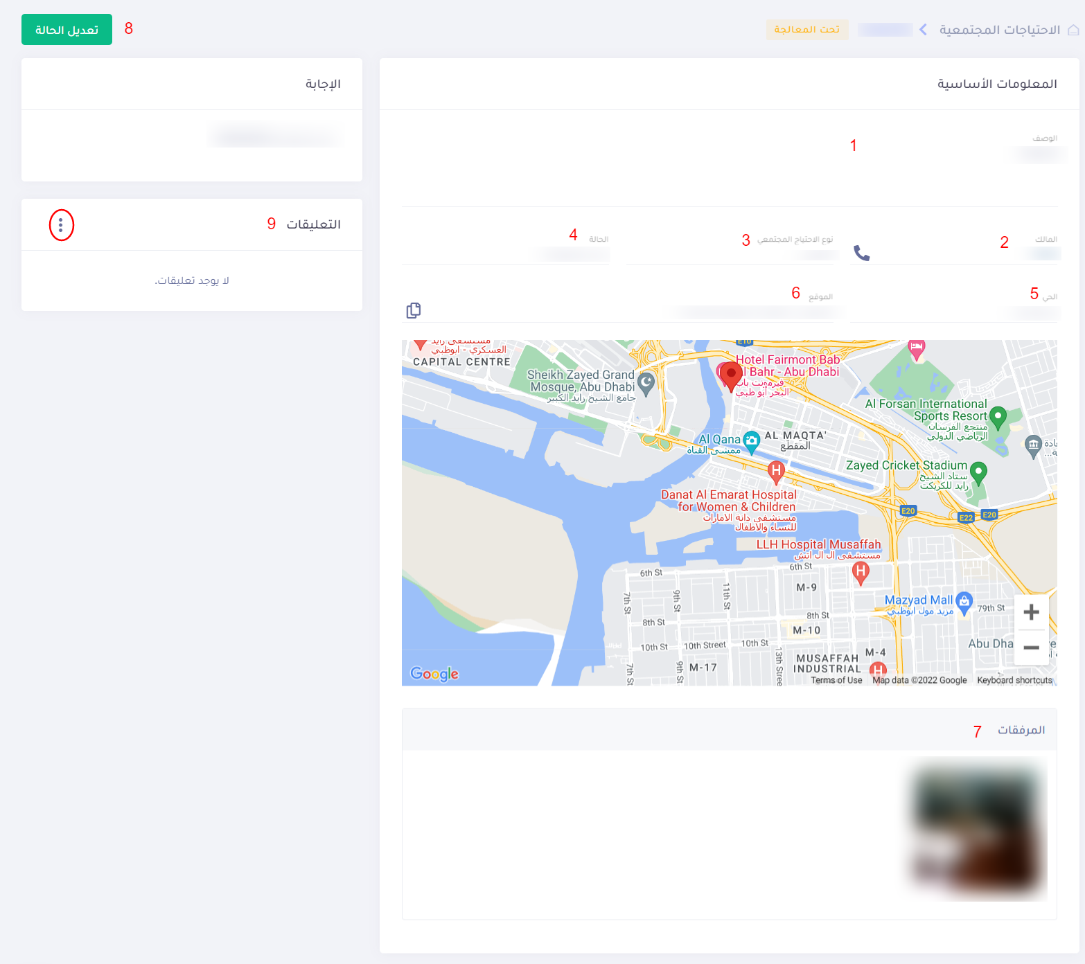 في حال قام المستخدم بالضغط على احد صفوف الاحتياج المجتمعي يتم تحويله الى صفحة عرض تفاصيل الاستشارة حيث تحتوي الصفحة على :