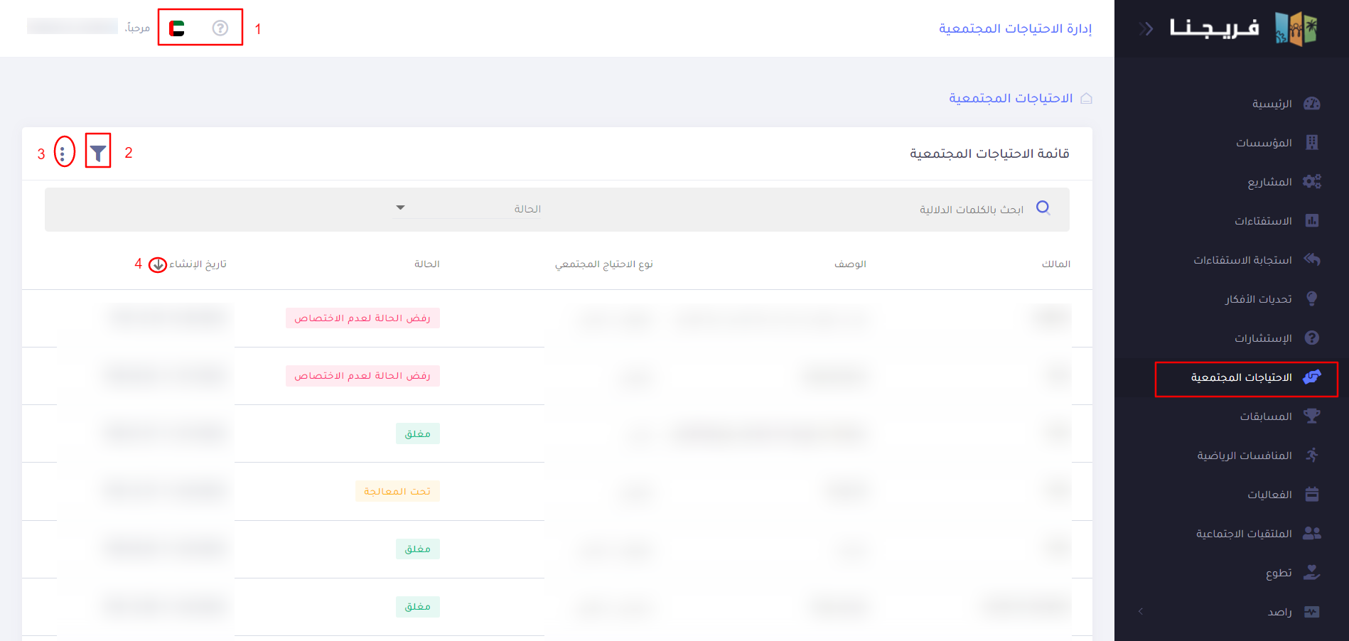 - يمكن لمستخدم الإدارة ان يستعرض الاحتياجات المجتمعية باللغات المختلفة (العربية و الإنجليزية) , وإشارة ؟ تشير الى دليل استخدام فريجنا للمساعدة على فهم الاحتياجات المجتمعية.