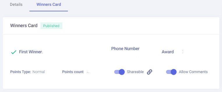 After publishing the winner card, it appears in the App and then the Winner card status is published
