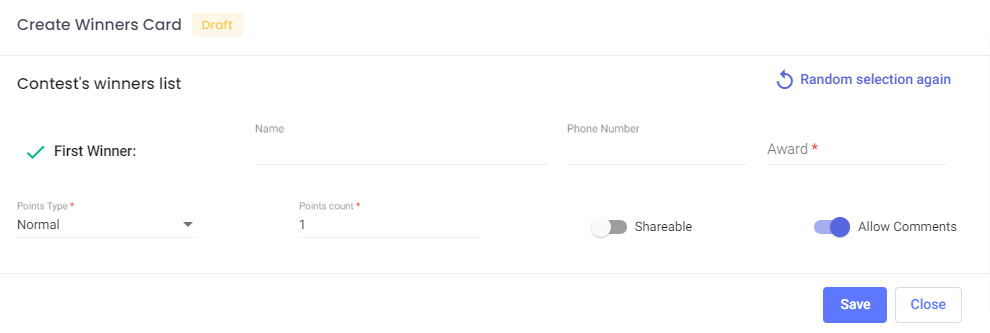 After choosing the winners number the admin has the option to choose the award for each winner or reselect the winners randomly again , after that the admin can select the shareable option.
