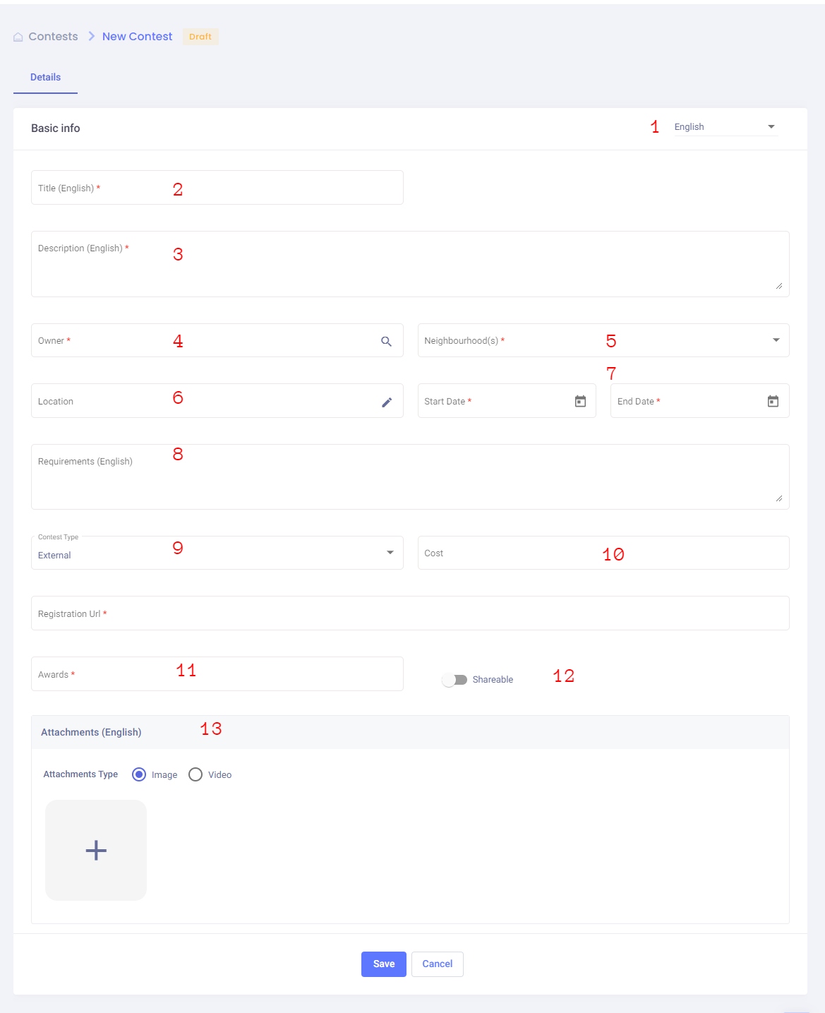 - Attachments (required) : the admin must add the an attachment (image or video) based on selected language in option1 to the contest :