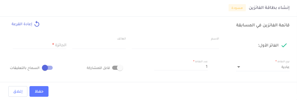 بعد اختيار عدد الفائزين يملك المدير الخيار باختيار مكافئة لكل فائز ويمكن له أن يقوم بإعادة قرعة اختيار الفائزين عشوائياً، بعدها يمكن للمدير أن يقوم باختيار خيار السماح للمستخدمين بمشاركة البطاقة.