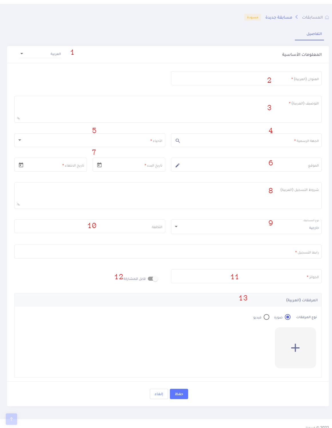 - الموقع (اختياري) : تسمح للمدير أن يقوم بإضافة الموقع المحدد للمسابقة