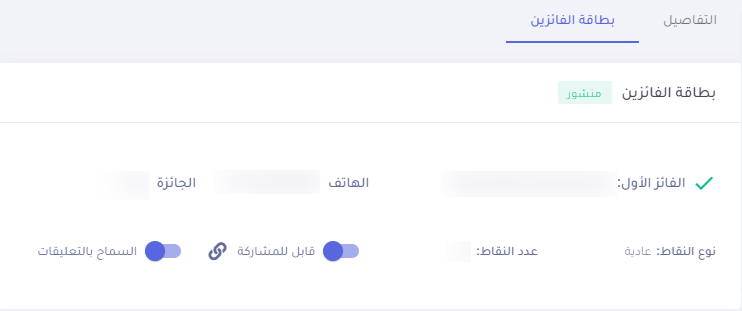 بعد القيام بنشر بطاقة الفائزين تظهر البطاقة في التطبيق وتكون حالتها منشورة