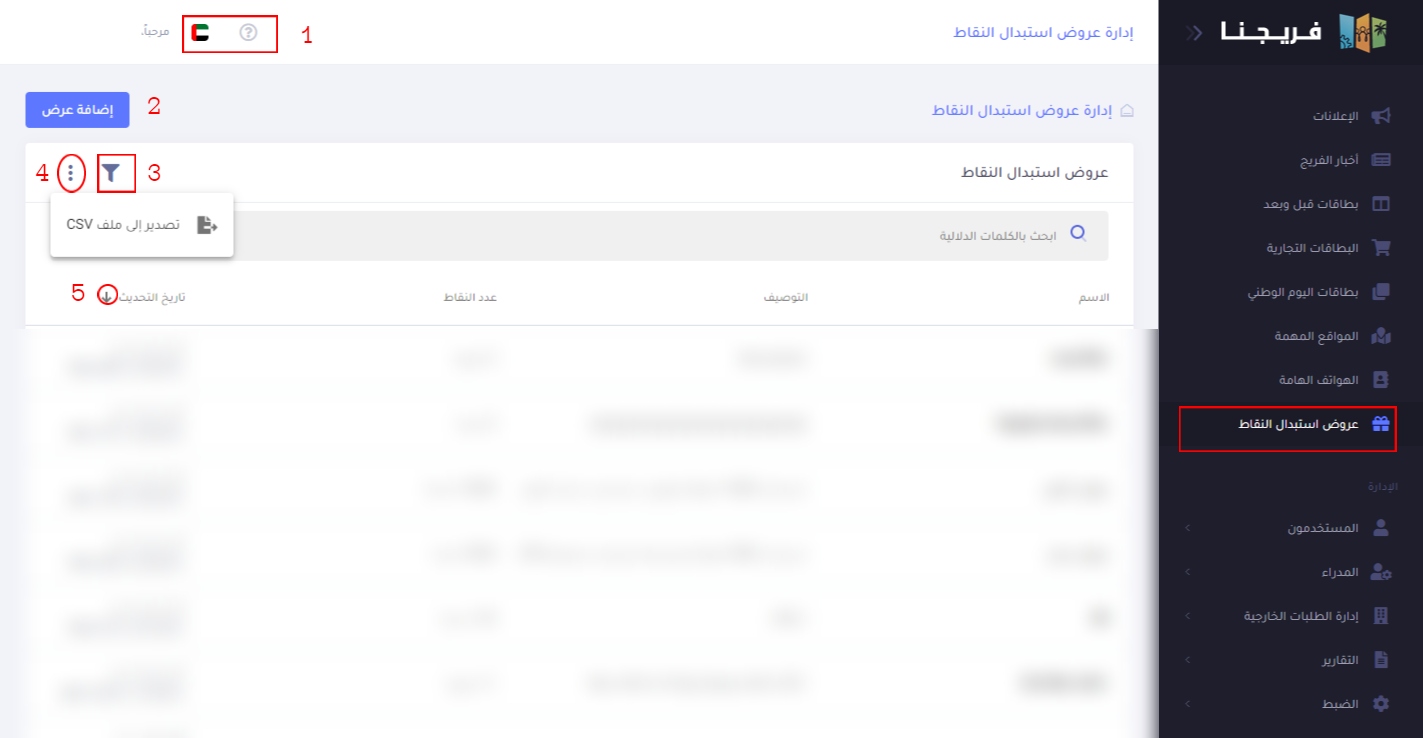 - يمكن لمستخدم الإدارة ان يستعرض عروض استبدال النقاط باللغات المختلفة (العربية و الإنجليزية) , وإشارة ؟ تشير الى دليل استخدام فريجنا للمساعدة على فهم عروض استبدال النقاط.