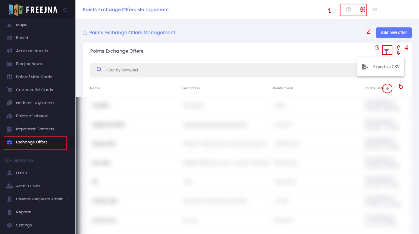 All the exchange offers that were added to the Freejna database are displayed according to the date they were added, and the table displays information about the exchange offer’s name, description, points count and the updated date.