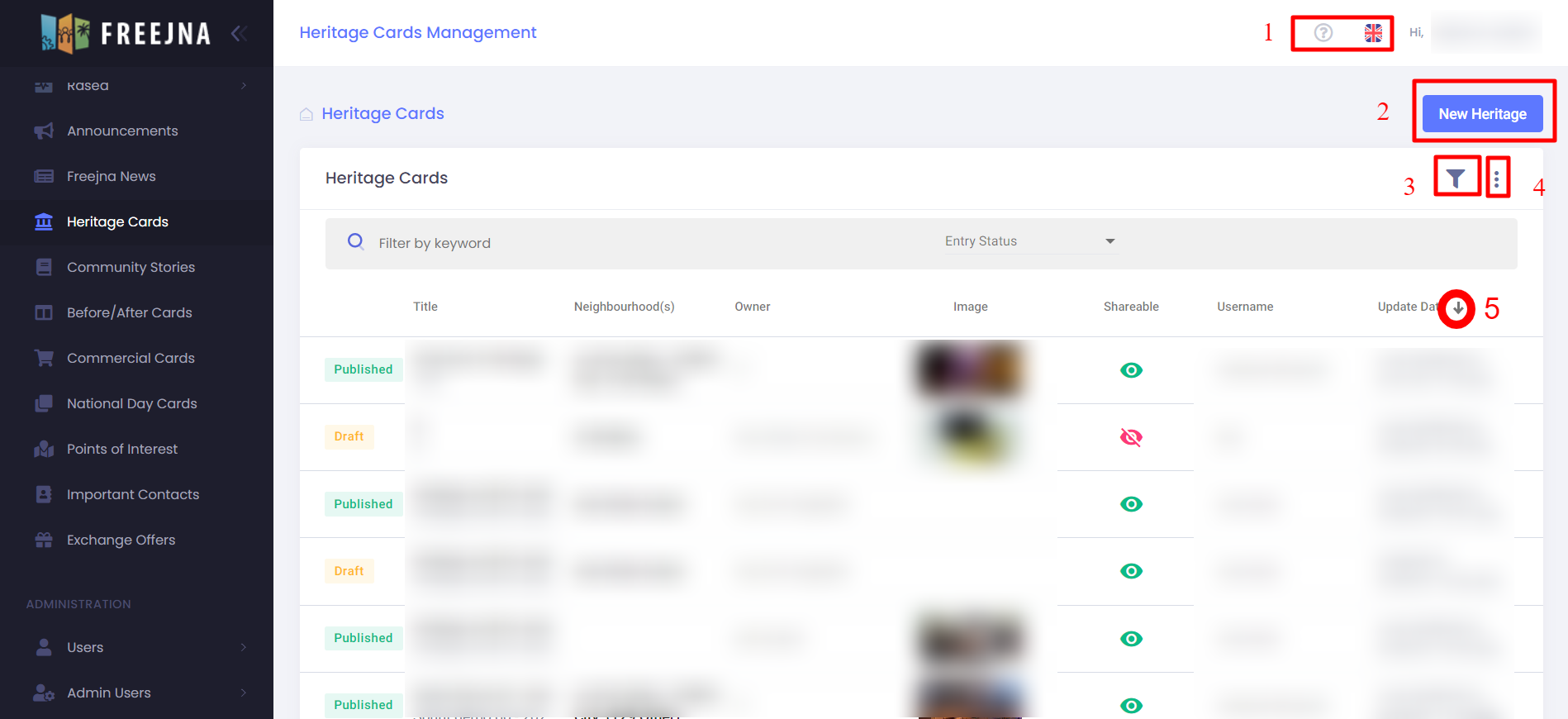 All heritages cards that were added to the Freejna database are displayed in a table containing information about the heritages cards (title, neighborhood(s), card owner, card image, shareable, username and card updated date).