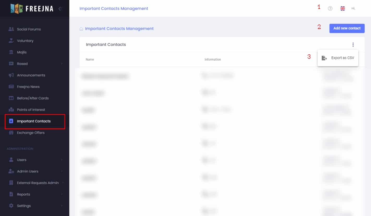 All the Important Contacts that were added to the Freejna database are displayed according to the date they were added, and the table displays information about the Important Contact’s name, information and the updated date.