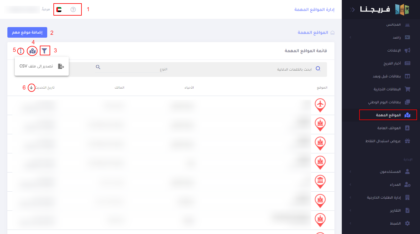 - يمكن لمستخدم الإدارة ان يستعرض المواقع المهمة باللغات المختلفة (العربية و الإنجليزية) , وإشارة ؟ تشير الى دليل استخدام فريجنا للمساعدة على فهم المواقع المهمة.
