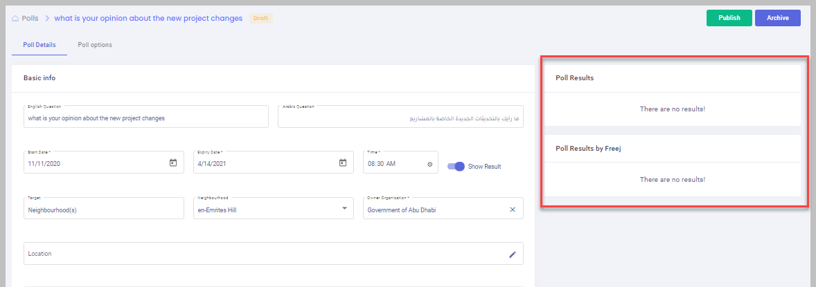 - The admin clicks save to save the changes; then he will be redirected to the poll edit page where he can publish or archive the poll