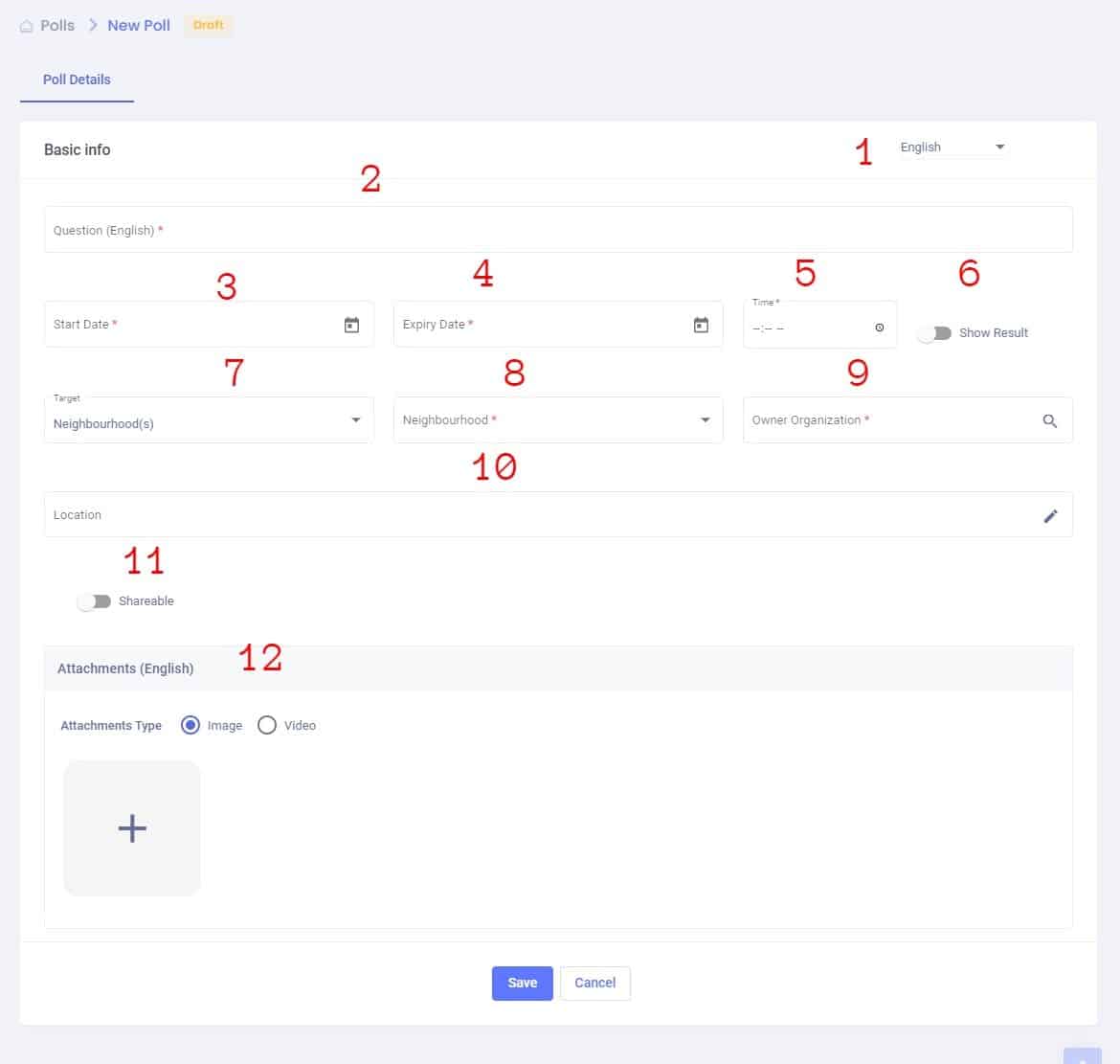 12. Attachments (optional) : the admin can add the an attachment(image or video) to the poll based on selected language in option1: