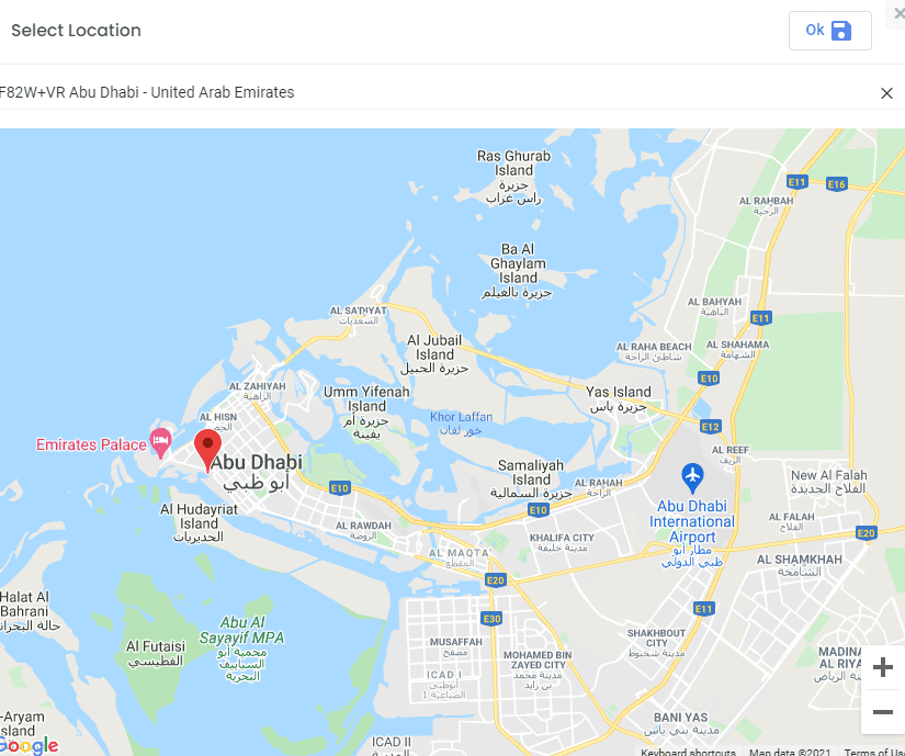 When the admin selects “Choose Location” a popup appears, and the admin searches for a location by typing its name in the search box or changing the marker position, the admin saves the location by pressing “OK”