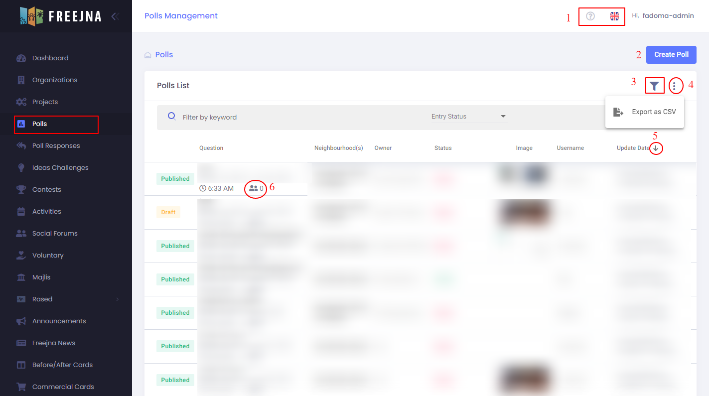 All polls that were added to the Freejna database according to the date of their addition are displayed in a table containing information about the polls (questions , neighborhoods, owner, Status, Images, username, update date)
