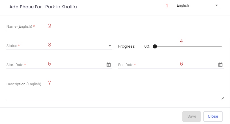 In this form Admin user enters the required data for adding projects which contain : - Title (Required) : The admin can add title based on selected language in option1