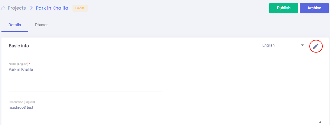The Admin can edit a project by pressing on the project record in the projects table, then he will be redirected to the project form so he can edit any data he wants by pressing the edit button in Basic Info Section or Pictures section