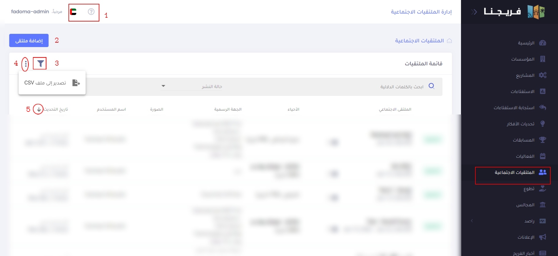 - يمكن لمستخدم الإدارة أن يقوم بتصدير قائمة الملتقيات الاجتماعية الموجودة كملف CSV.