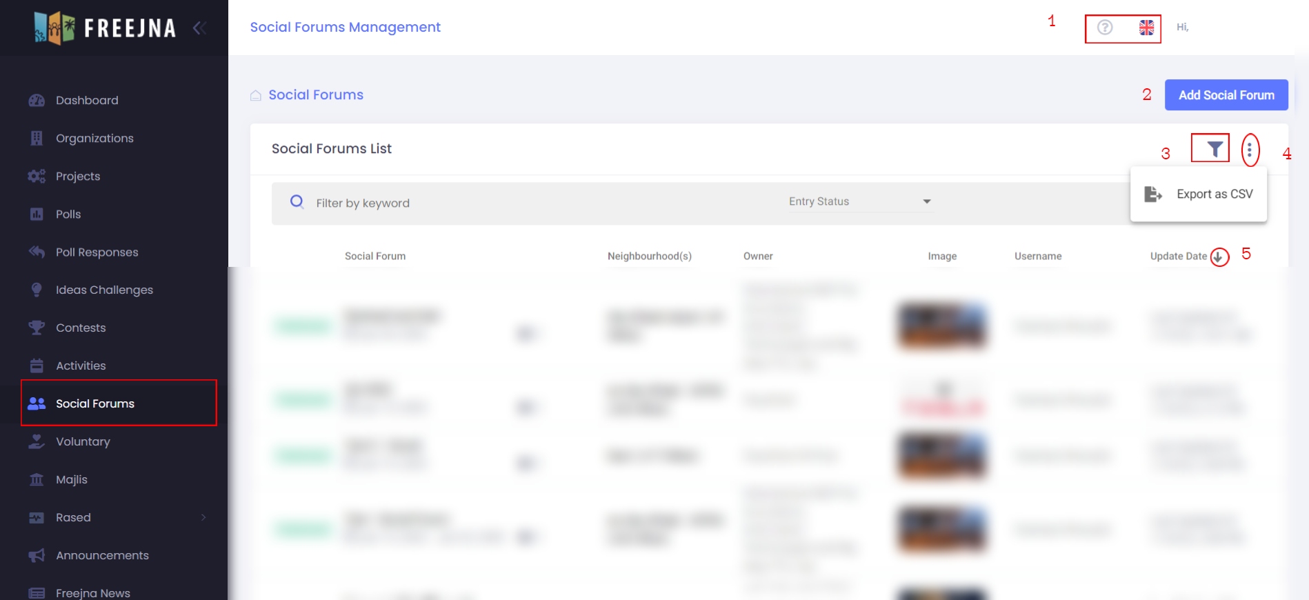 All social forums that were added to the Freejna database are displayed in a table containing information about the social forum (social forum description, neighborhood(s), social forum owner, social forum image, username, social forum updated date).