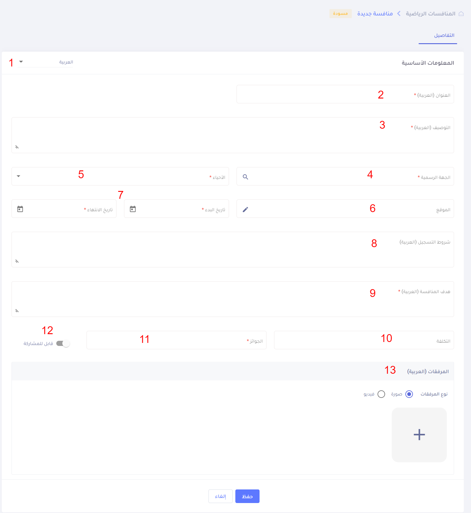 - الموقع (اختياري) : ففي حال اختياره يتم تحديد المنطقة التي ترتبط بها هذه المنافسة