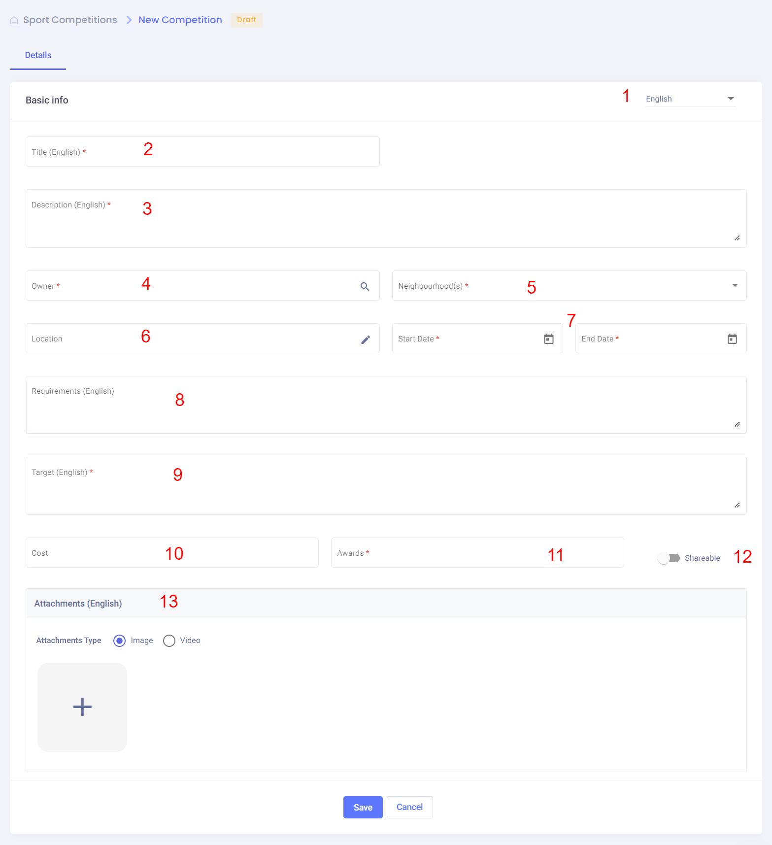 - Start Date (required) : the start date of a competition and it should be greater than the current date End Date (required) : the end date of a competition