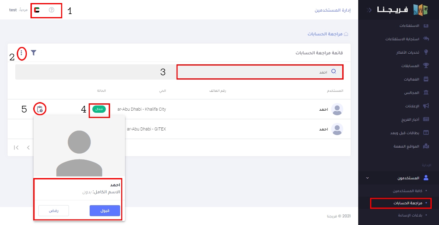 جميع حسابات المستخدمين الذين تم اضافتهم تظهر في قائمة مراجعة الحسابات مما يتيح للمدير قبول الحساب أو رفضه متثمله هذه القائمة بـ( اسم المستخدم ورقم هاتفه والحي التابع له وحالة حسابه)