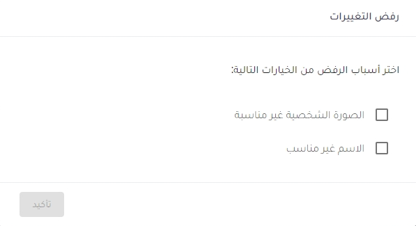 - يمكن للمدير قبول الحساب أو رفضه في حال الرفض تظهر شاشة لتحديد سبب الرفض