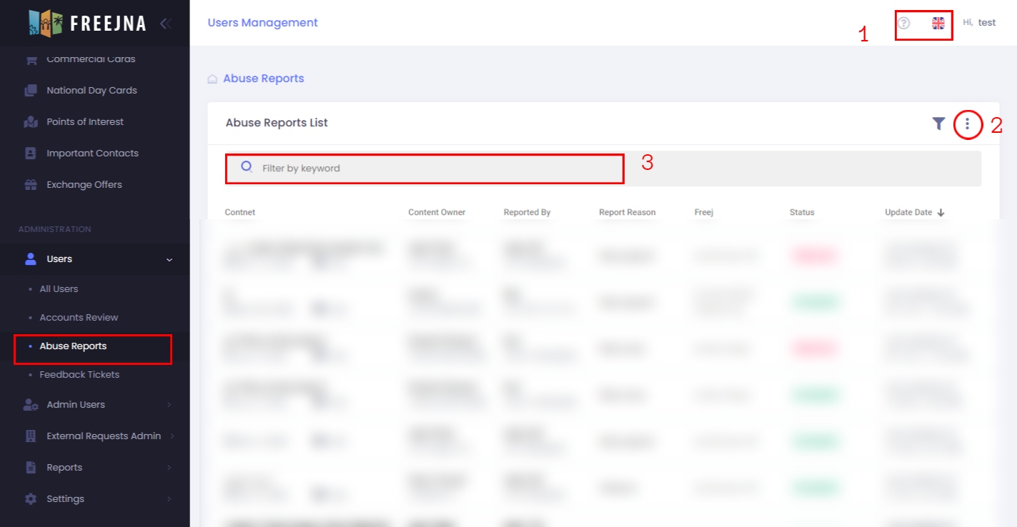 All abuse reports that were added to the Freejna database according to the date of their addition are displayed in a table containing information about the users (content , content owner, reported by , reported reason ,freej , reported date, status)