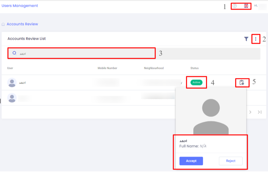 All accounts review that were added to the Freejna database according to the date of their addition are displayed in a table containing information about the users (user, mobile number, neighborhoods , status)